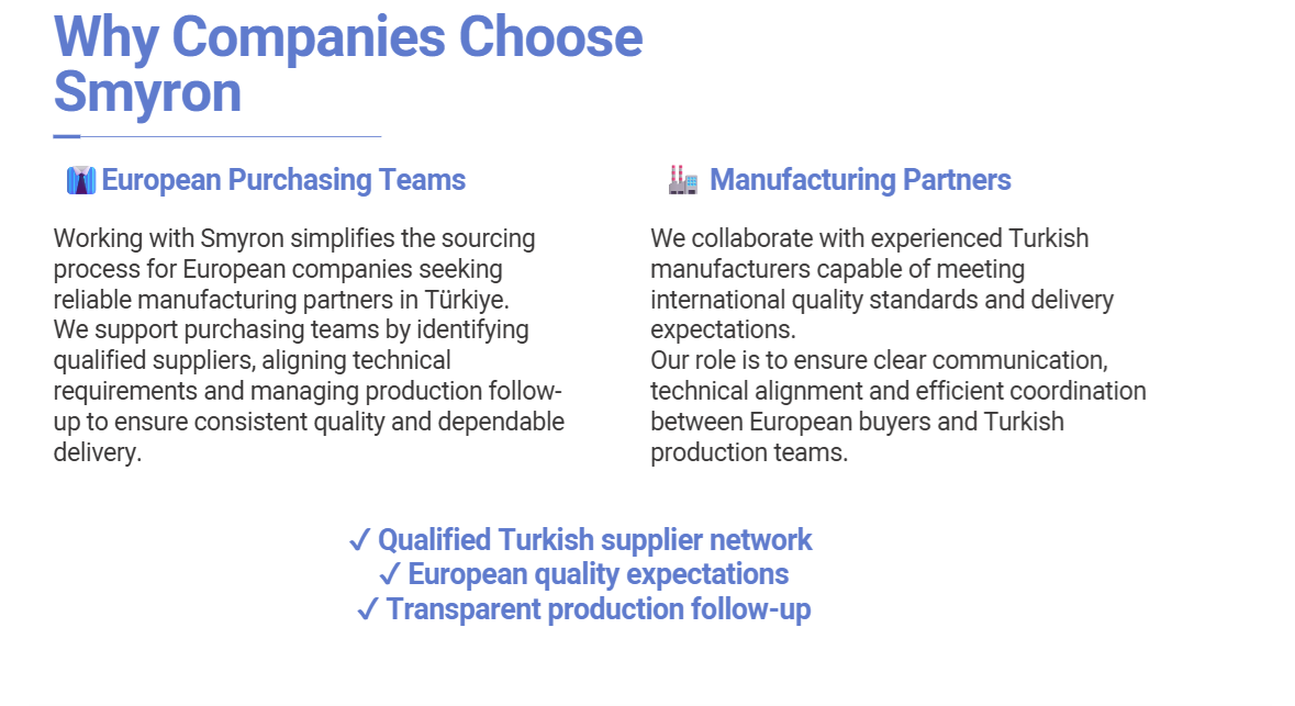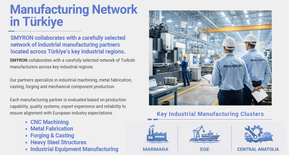 SMYRON supports European companies in identifying qualified Turkish manufacturers, aligning technical requirements and ensuring reliable industrial sourcing across multiple sectors.