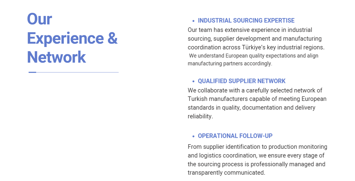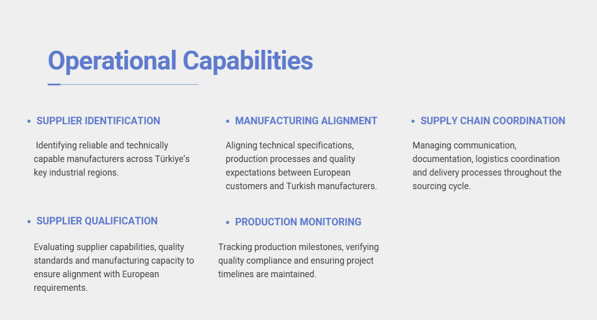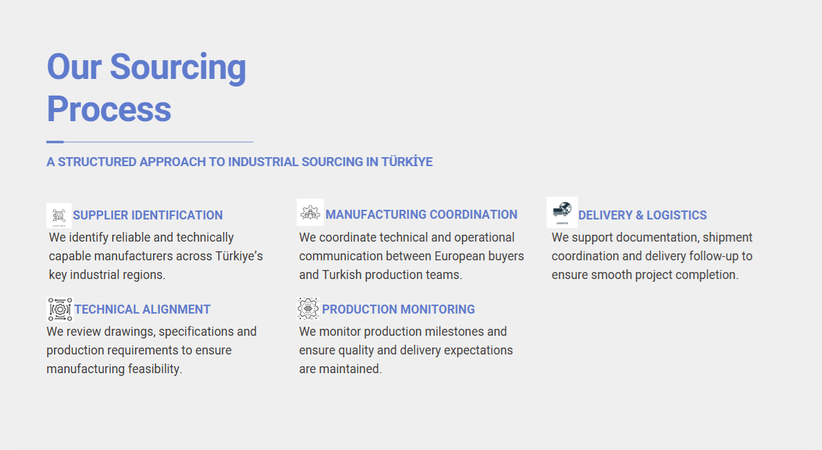 SMYRON connects European companies with qualified manufacturing partners in Türkiye. We specialize in structured industrial sourcing, supporting companies in identifying reliable suppliers, aligning manufacturing requirements and monitoring production to ensure consistent quality and on-time delivery. Through our established supplier network and deep understanding of industrial manufacturing, we simplify the sourcing process and create transparent, dependable supply chains between Europe and Türkiye. Our sourcing model integrates supplier identification, qualification, manufacturing alignment and production monitoring to deliver longterm value for our partners.